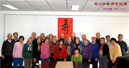 2015年12月22日,蔬菜花卉所综合楼212会议室里热闹非凡,正面墙上一幅巨大的“寿”字和寿桃花篮诗画格外引人注目,这是研究所第六党支部给年届80岁和80岁以上老同志集体过生日的现场。