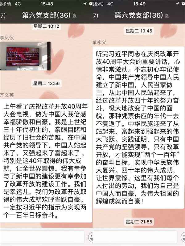 大会结束后,离退休人员党支部在第一时间将习近平总书记在庆祝改革开放40周年大会上的讲话链接推送至老干部微信群,让老干部更好地学习领会讲话精神,传播中国好声音。