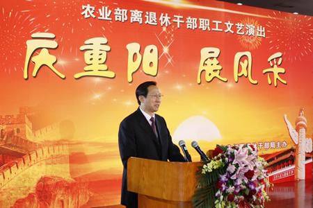 2010年10月14日上午,农业部离退休干部局举办了“庆重阳 展风采”文艺汇演活动。农业部部长韩长赋,中央国家机关工委老龄办常务副主任王平,部离退休干部工作领导小组成员单位负责同志,部机关、部属事业单位的负责同志与广大离退休干部一起共庆九九重阳节。韩长赋部长作了重要讲话。