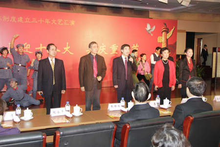 离退休干部局在职干部表演的诗歌快板情景剧《老干局三十年》,拉开了文艺演出序幕。部系统老同志表演了舞蹈《幸福生活拍拍手》、音画组合《快乐的学习生活》、表演唱《最美不过夕阳红》、服装展示《岁月如歌》等丰富多彩的文艺节目。大家用嘹亮的歌声、优美的舞姿、绽放的笑容,歌颂中国共产党的辉煌成就,表达迎接党的十八大胜利召开的喜悦之情,展示老同志幸福快乐的晚年生活。
